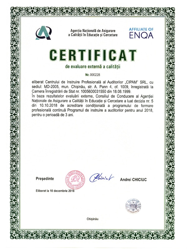 Pentru desfasurarea activitatii sale in cîmpul legal, “CIPAM” SRL a obtinut Autorizatie provizorie pentru activitatea in domeniul invatamintului (desfasurarea activitatii de de instruire in invatamintul pentru adulti), seria 00, nr 0307, eliberata de Ministerul Invatamintului al Republcii Moldova, la data de 18.01.2000, valabila pina la data de 18.01.2005. Ulterior “CIPAM” SRL a obtinut Licenta seria: A MMII, nr. 023475, eliberata la data de 16.01.2007 si valabila pina la data de 16.01.2012 pentru desfasurarea activitatii de invatamint pentru adulti, cu denumirea cursurilor „ Instruirea si perfectionarea auditorilor (auditul general al agentilor economici/auditul financiar” 120 ore). Odata cu radierea licentierii pentru instruirea profesionala continua a adultilor si alte forme de invatamint, Programele de studii, elaborare in fiecare an, au fost aprobate/coordonate de Ministerul Învataminutlui al RM si Ministerul Finantelor al RM, coform dispozitiilor legale ale perioadei 2012-2017. Actualmente Centrul îsi desfasoara activitatea in baza Programului de studii coordonat cu Ministerul Educației Culturii și Cercetării, Ministerul Finanțelor si Consiliului de Supraveghere Publică a Auditului. Deasemenea, intru respectarea HG nr 193 din 24.03.2017 “pentru aprobarea Regulamentului cu privire la formarea continuă a adulților”, CIPAM SRL a acreditat programul de studii la ANACEC, obținînd Certificat de evaluare externa a calitatii nr 000228, emis la data de 10.12.2018 si valabil pentru o perioada de 3 ani.