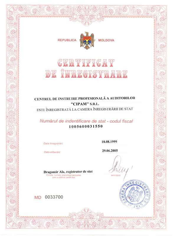 CENTRUL DE INSTRUIRE PROFESIONALĂ AL AUDITORILOR “CIPAM” SRL, a fost fondat la data de 18.08.1999, Certificat de inregistrare de stat seria:A nr: 150256 eliberat la 26.10.1999, fondator Asociatia Auditorilor si Societatilor de Audit “AFAM” (cota 100%). Conform prevederilor legale “CIPAM” SRL a fost reinregistrata de Camera Înregistrarii de Stat la data de 29.06.2005, cu atribuirea codului fiscal:1005600031550, fapt confirmat prin eliberarea Certificatului de Înregistrare MD 0033700 din 29.06.2005.